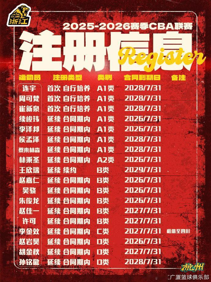 截至8月31日,我俱乐部已完成2025-26赛季CBA联赛国内球员注册工作。本赛季俱乐部共注册18名队员,其中李金效租借至四川锦城篮球俱乐部,租期剩余1年。